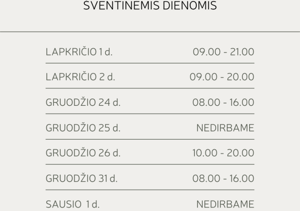 DARBO LAIKAS LAPKRIČIO 1–2 DIENOMIS