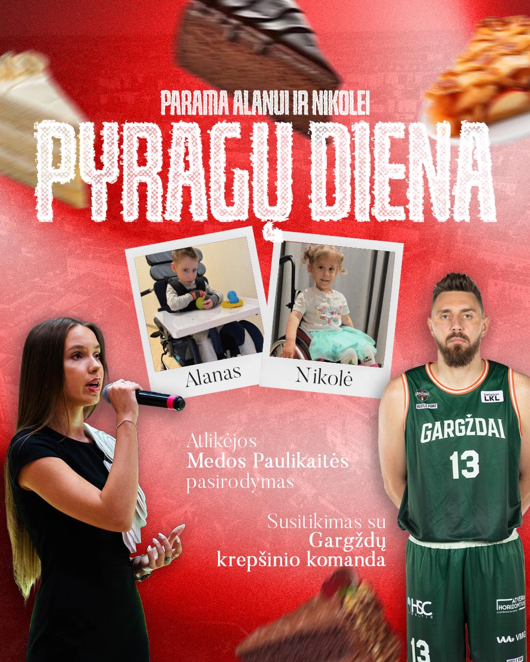 Visą dieną, ketvirtadienį, kviečiame užsukti į Gargždų daugiafunkcį sporto centrą, kur galėsite pasimėgauti gardžiais pyragais ir paaukoti paramai Alanui ir Nikolei – dviem mažiesiems kovotojams, kuriems labai reikalinga mūsų pagalba.
