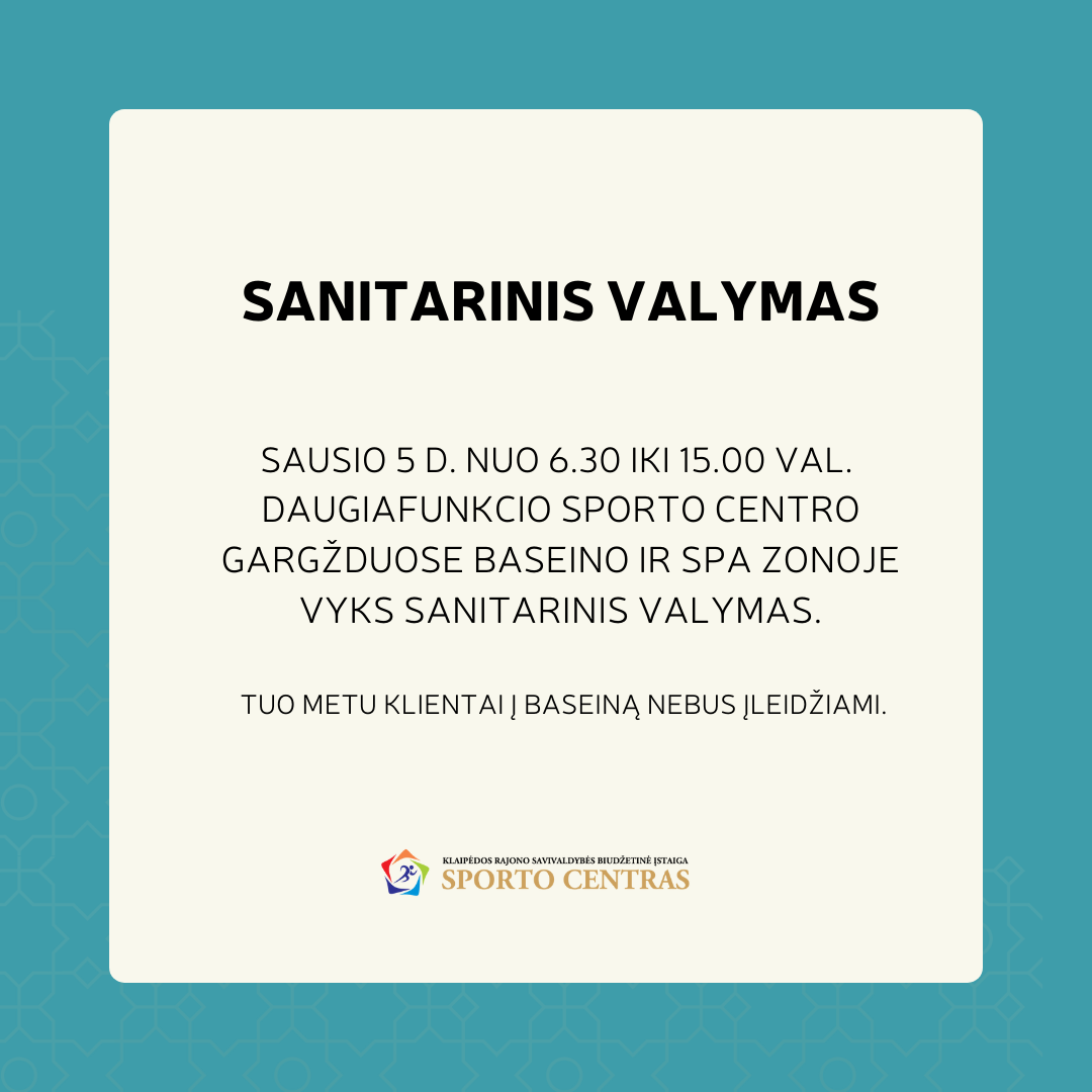 Informuojame, kad sausio 5 d. nuo 6.30 iki 15.00 val. baseino ir SPA zonoje bus vykdomas sanitarinis valyma.