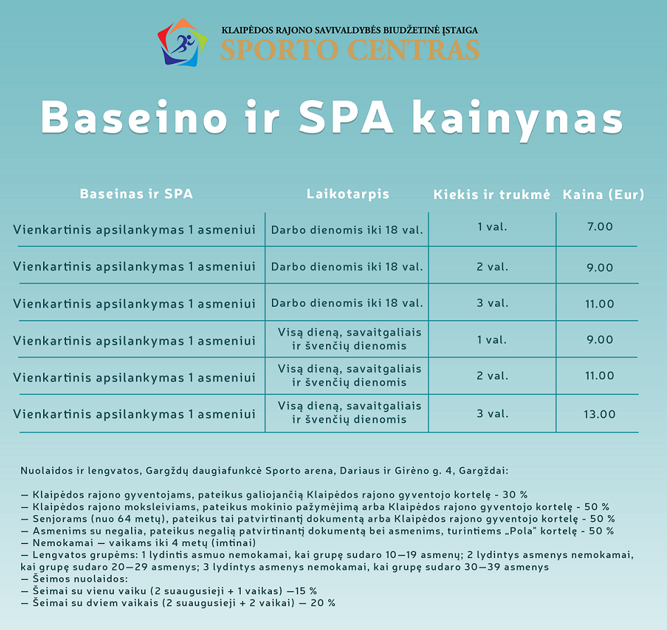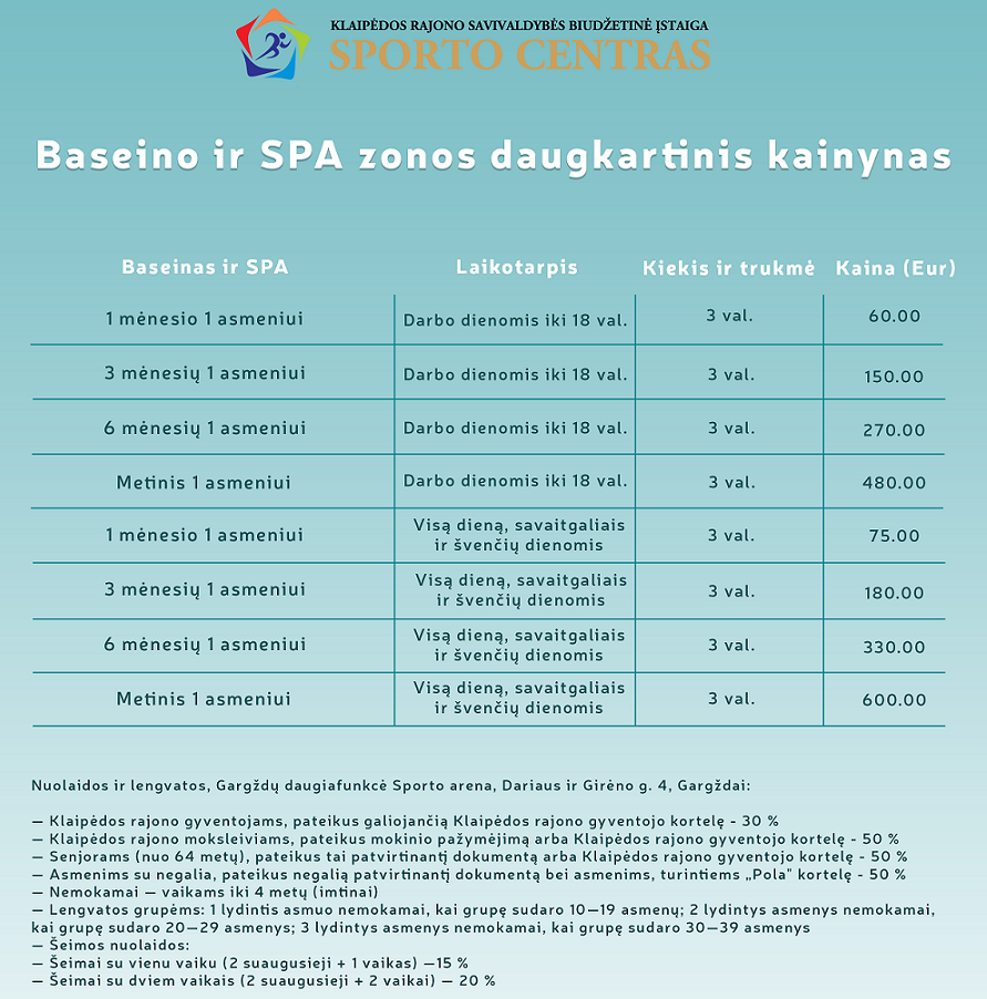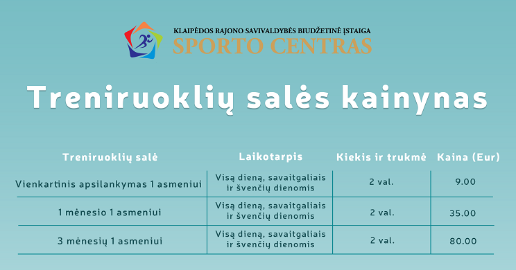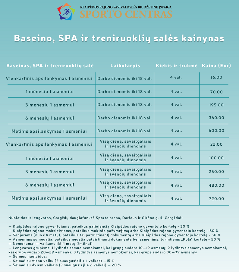 Dėmesio lankytojams! El. prekybos puslapis yra kūrimo procese, todėl vienkartinius apsilankymus ir abonementus kviečiame įsigyti Daugiafunkcinio sporto centro registratūroje adresu Dariaus ir Girėno g. 4, Gargždai. Ačiū už supratingumą!
